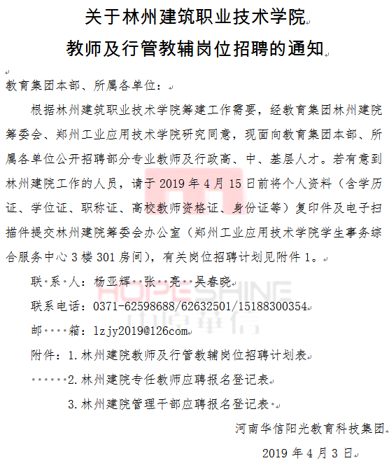 关于林州建筑职业技术学院 教师及行管教辅岗位招聘的通知